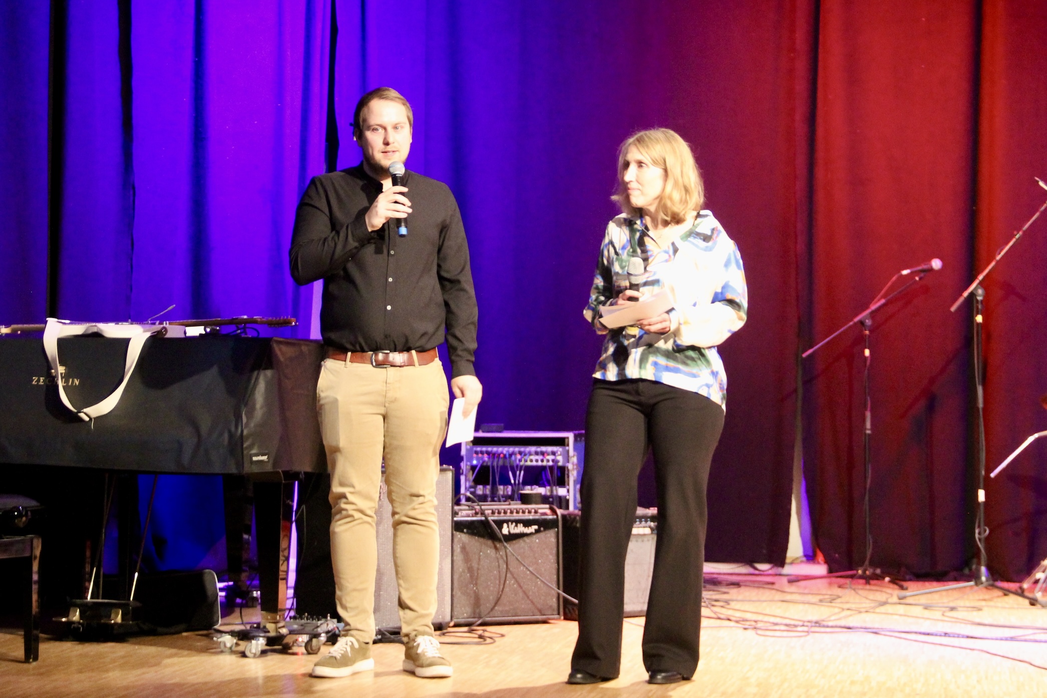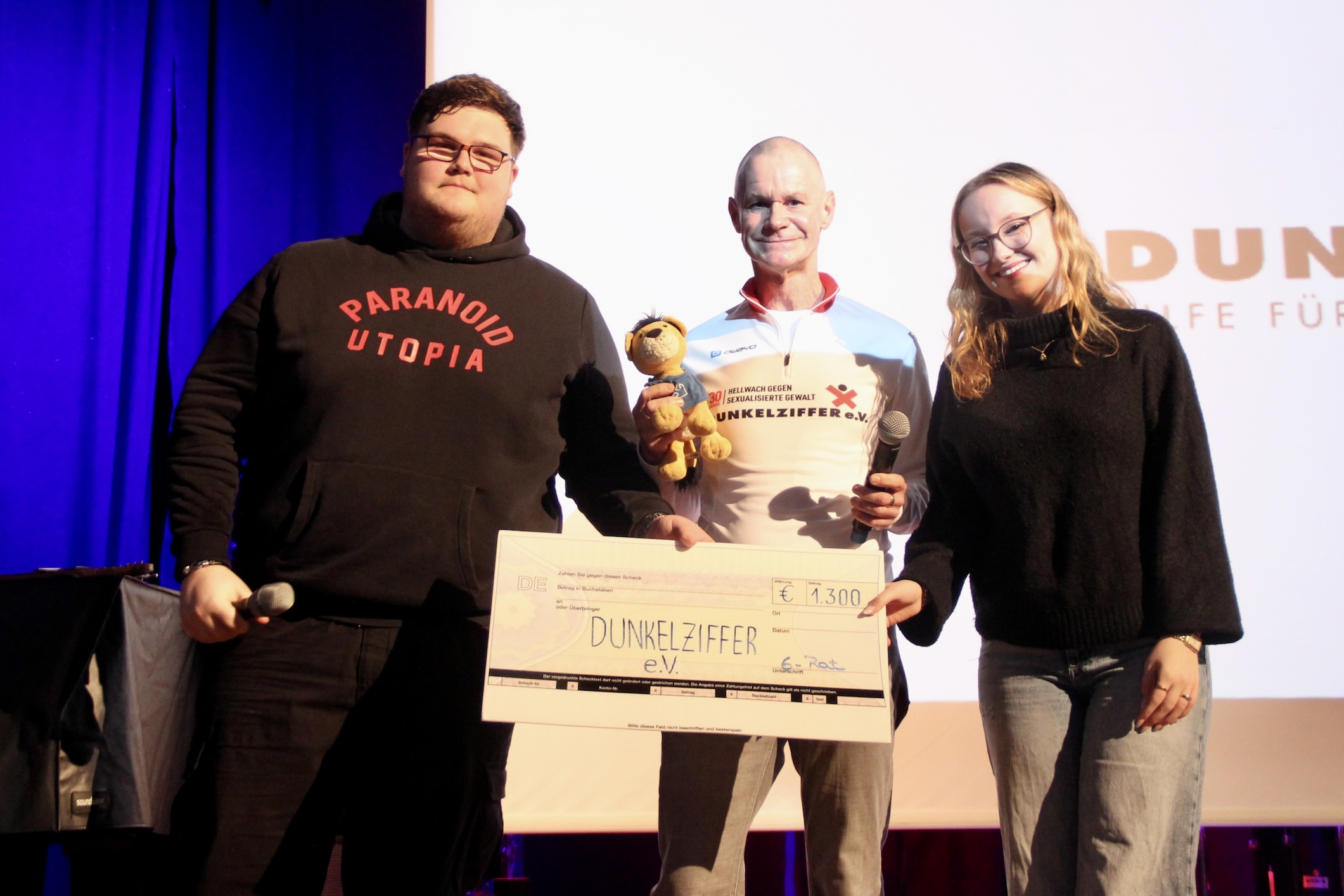 Danach bat Amy die Verantwortlichen des Kinderhospizdienstes "KidsAnker" auf die Bühne. Auch diese stellten sich und ihre Organisation vor, und Lenni überreichte ihnen ebenfalls einen Scheck von 1.300 €. Anschließend lud Johanna den Vertreter der letzten externen Organisation, des Vereins "Dunkelziffer", auf die Bühne. Nach einigen erklärenden Worten darüber, was Dunkelziffer genau ist und macht, erhielt auch dieser einen Scheck von 1.300 €.