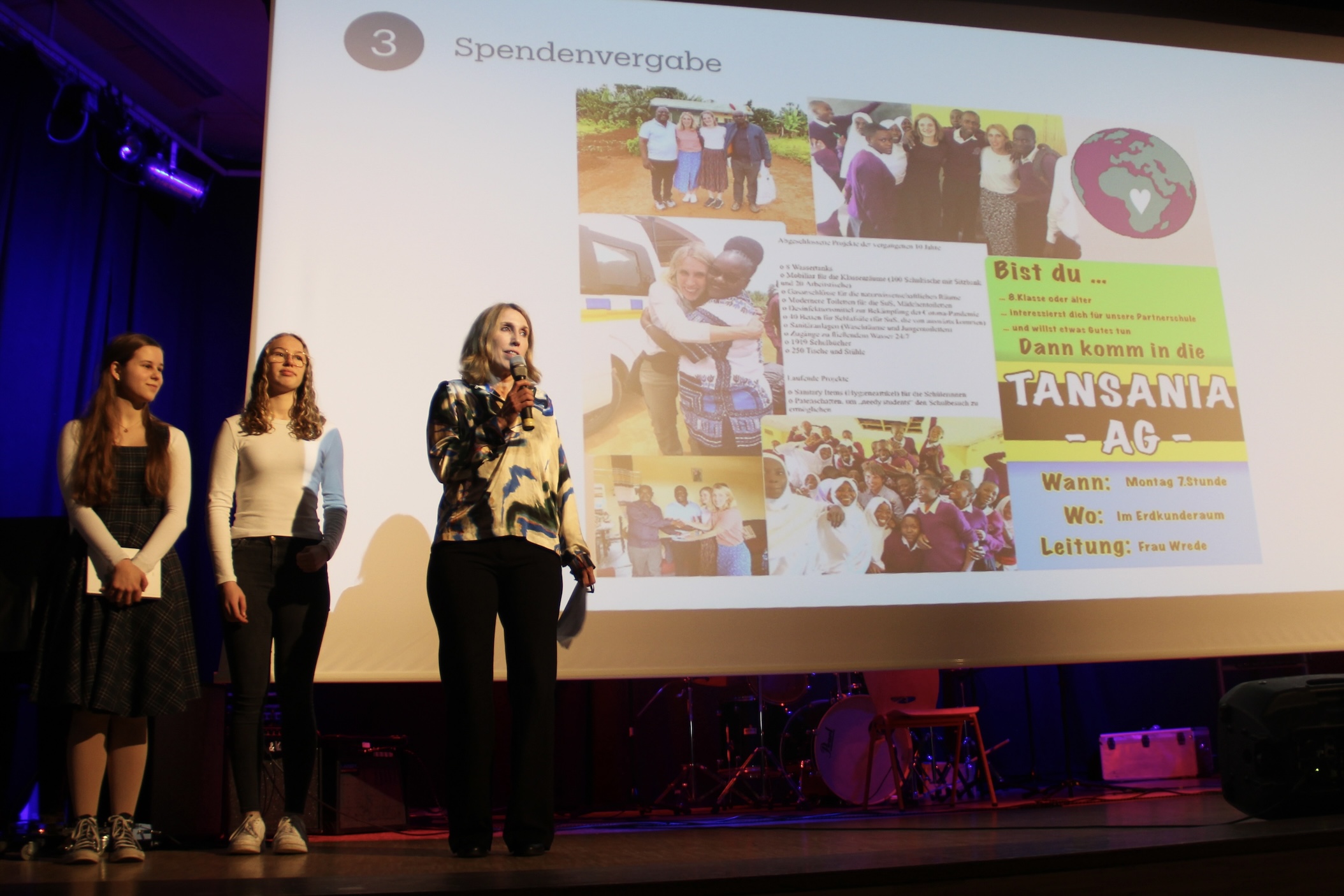 Die letzte Spendenvergabe betraf Frau Wrede und ihre Tansania-AG, die sich per digitaler Präsentation vorstellte. Ihnen wurde anschließend, erneut durch Lenni, ein Scheck über sogar 4.500 € überreicht.