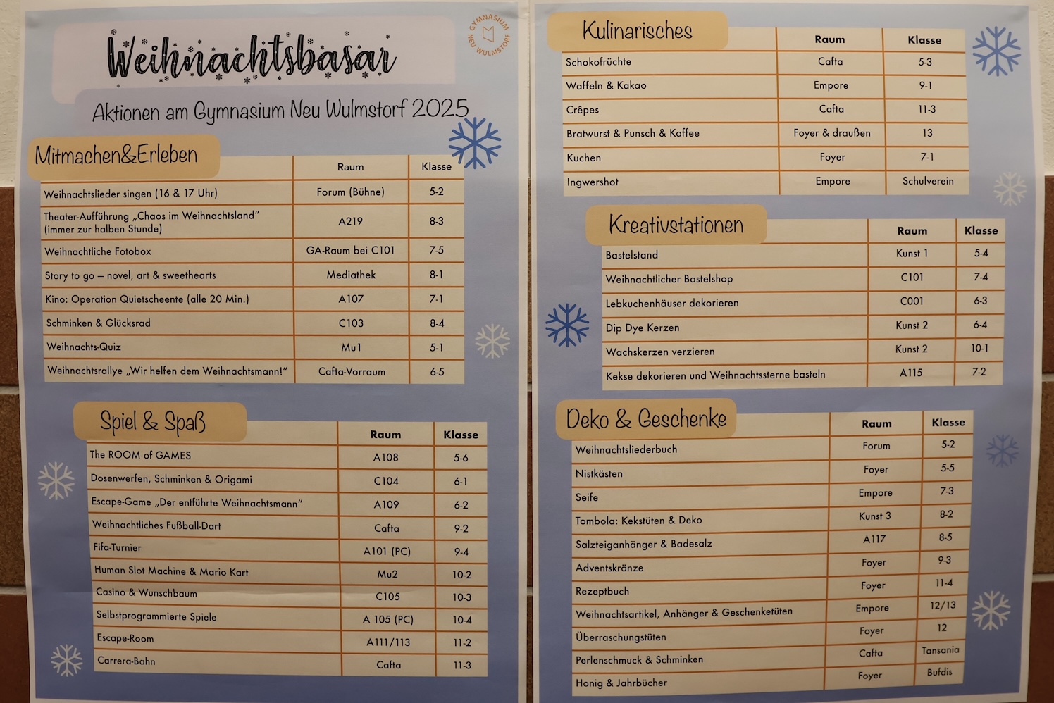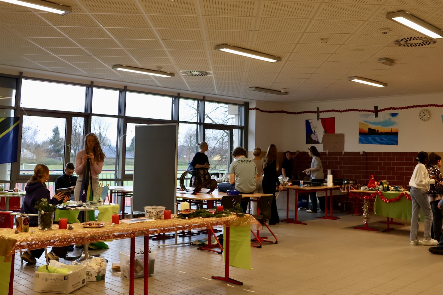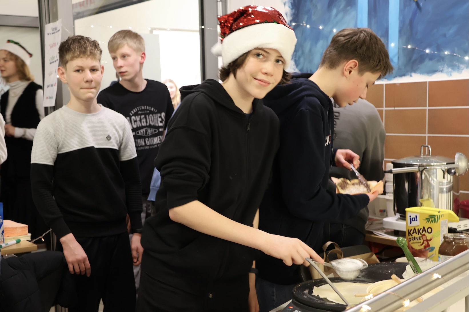 Die Klassen und Kurse des Gymnasiums hatten gemeinsam mit ihren Lehrkräften ein vielfältiges und liebevoll gestaltetes Angebot vorbereitet. An den zahlreichen Ständen gab es für Groß und Klein allerhand zu entdecken: Selbst gebastelte Weihnachtsdekorationen, handgefertigte Geschenke, kreative Mitmachaktionen sowie kleine Spiel- und Geschicklichkeitsstationen sorgten durchweg für Begeisterung. Auch das leibliche Wohl kam nicht zu kurz: Von frischen Waffeln über herzhafte Snacks bis hin zu warmen Getränken wurde den Gästen ein reichhaltiges kulinarisches Angebot präsentiert.