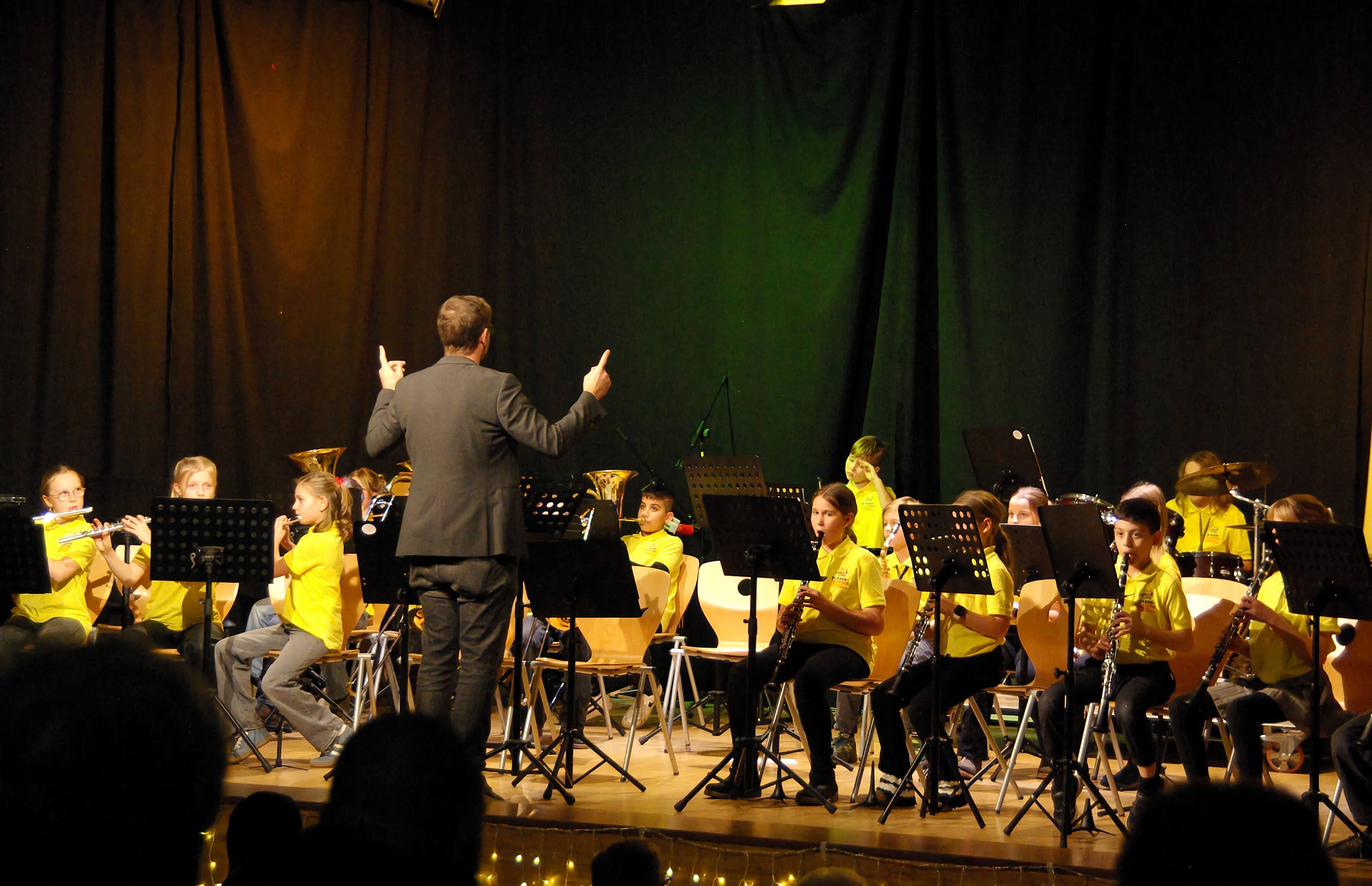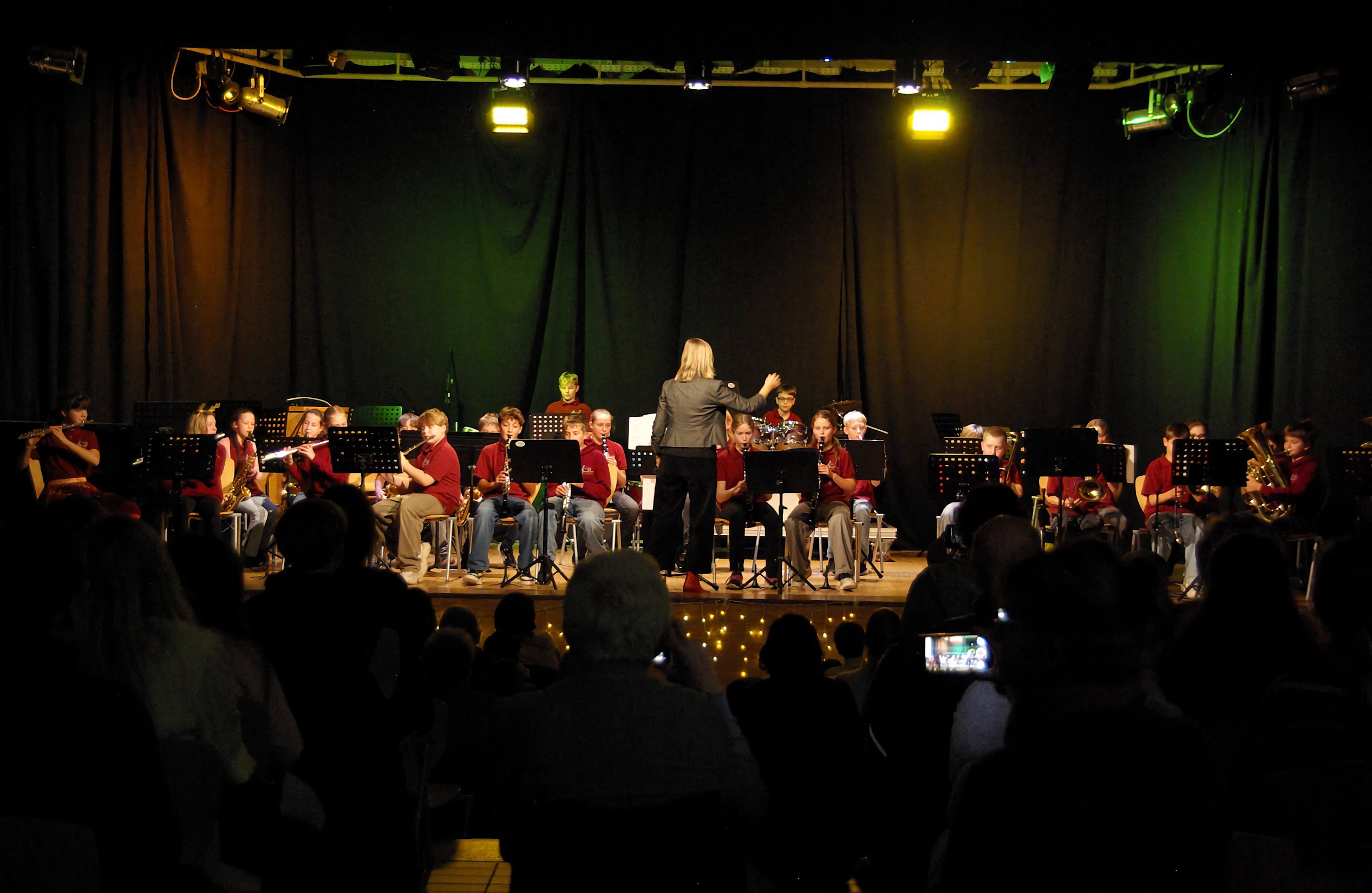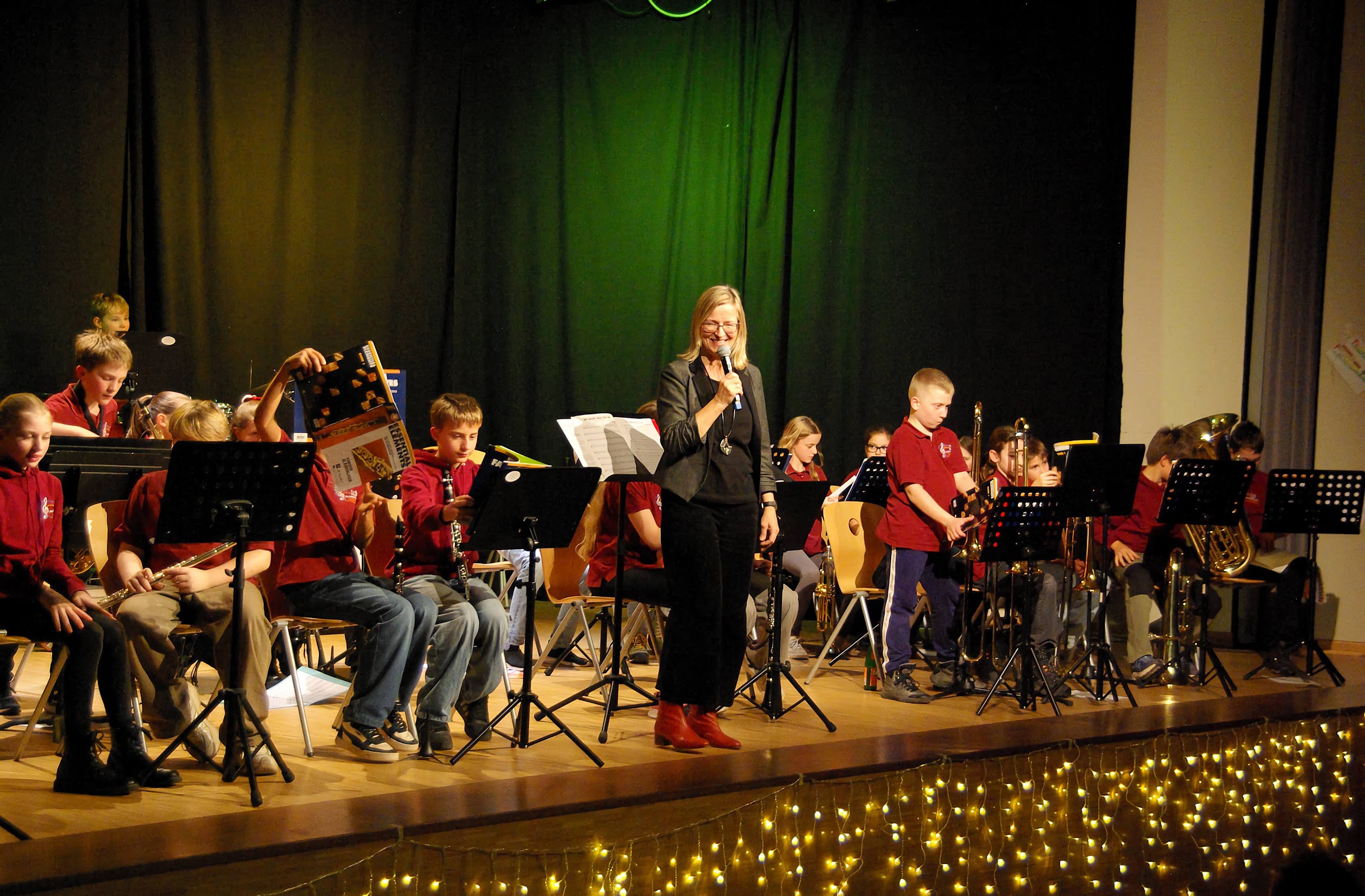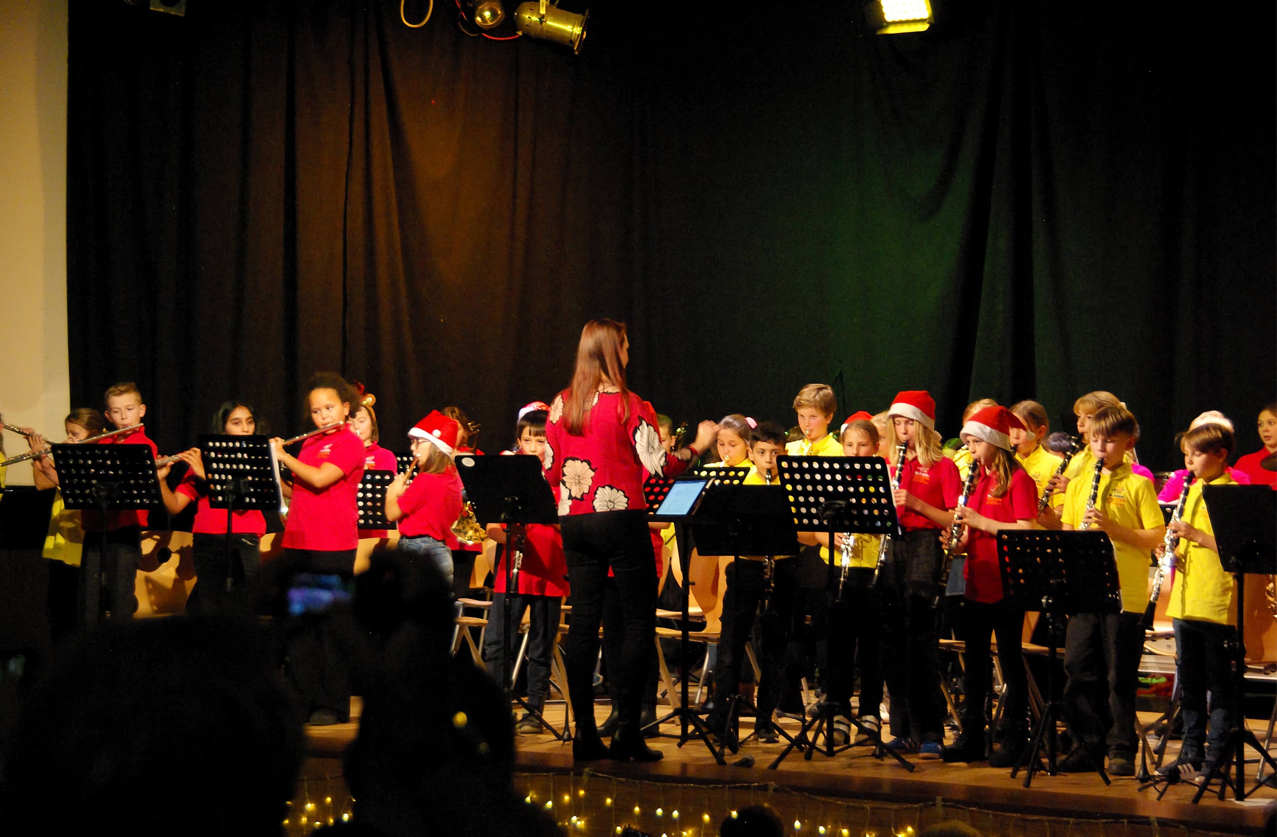 Ein Highlight in dieser ersten Hälfte war das gemeinsam vorgeführte Weihnachtslied Jingle Bells. Für das letzte Stück der 5-2 mischten sich auf der Bühne die gelben mit den roten Bläserklassenshirts zu einem bunten und farbenfrohen Orchester, fünfzig Kinder standen so auf der Bühne und spielten gemeinsam!