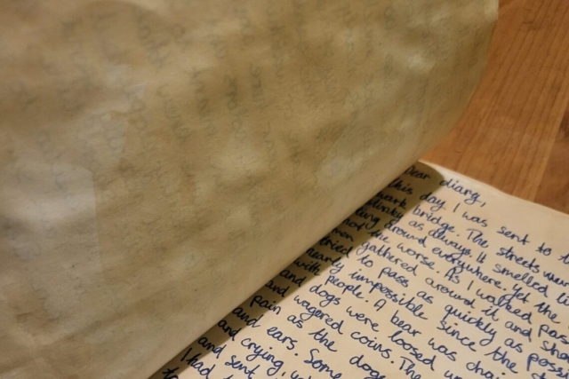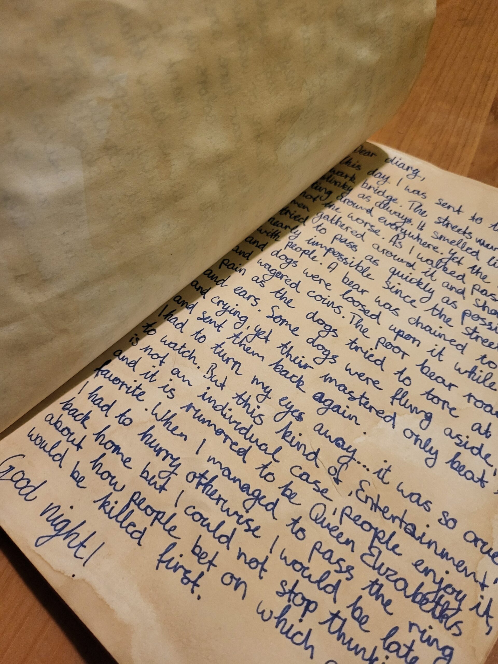 Um ihren Mitschülern und Mitschülerinnen einen Einblick in das damalige Alltagsleben und Entertainment der “Elizabethan Era” zu geben, hat sich eine weitere Gruppe dazu entschieden, ein Tagebuch aus der Sicht eines Dienstmädchens zu erstellen. Für dieses haben sie Papier mit Kaffee eingefärbt, das Buch selbst gebunden und die Einträge handschriftlich verfasst, sodass es möglichst zeitgetreu wirkt.